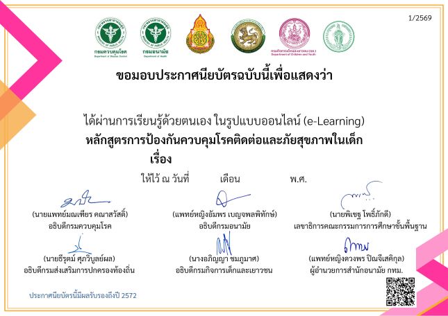- คุณสามารถติดต่อเจ้าหน้าที่ของ กองโรคติดต่อทั่วไป กรมควบคุมโรค ได้ผ่านทางอีเมล gcd.childcare@gmail.com หรือโทรศัพท์ที่หมายเลข 0-2590-3183 ในเวลาราชการ